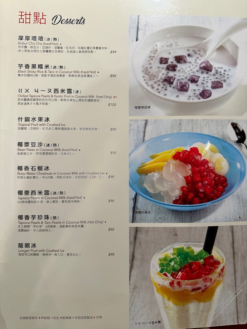 4.高麗菜180,蝦醬空心菜210,辣炒豬肉295,月亮蝦餅370,泰式咖哩雞320,椒麻雞315,香烤翼阪牛499。