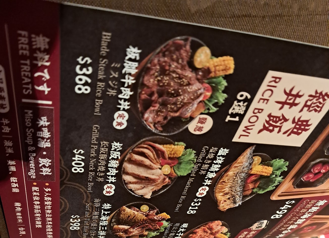 位在中友百貨B3的燒肉丼與燒烤店,雖然是第一次用餐,驚豔丼飯的肉品無論是豬,雞,牛或鰻魚都很新鮮好吃,單點多樣燒烤都很到味,上菜速度與服務都很棒;雖然有加10%服務費,但自取味增湯與熱麥茶或冰檸檬水都可以無限暢飲!