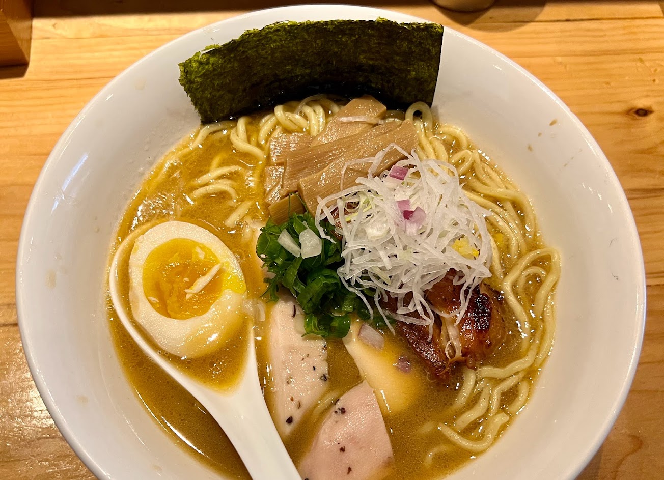 點了魚介豚骨拉麵,湯頭濃郁,麵條偏日式是比較硬的口感,份量痕足夠,肉有舒肥雞和豬肉,個人比較偏愛豬肉,店內座位只有13個,乾淨舒服明亮,桌上有冰涼的水和純高湯可以自己調整鹹度,整體來說,雖然不是我的菜,但感受到誠意滿滿。