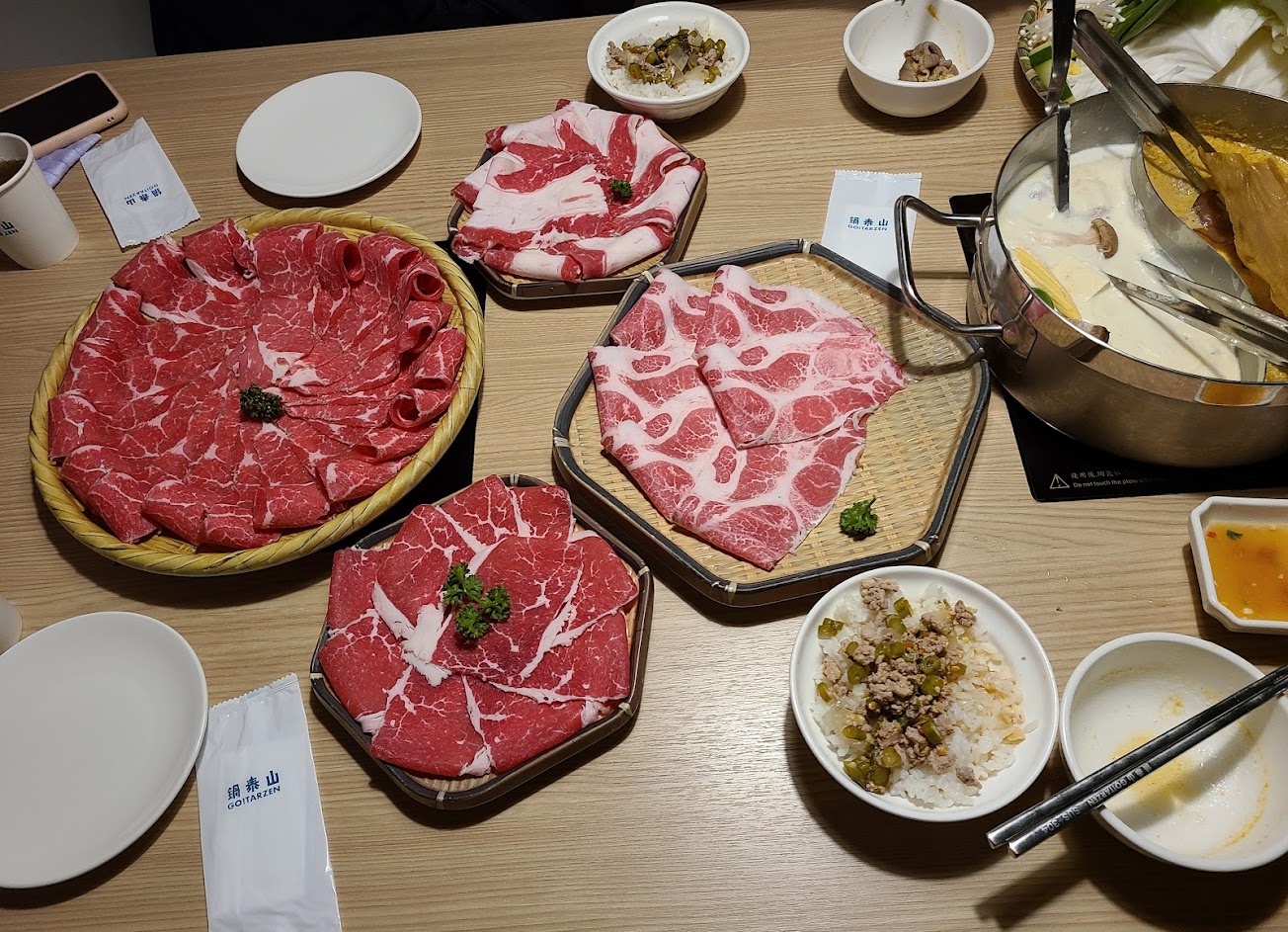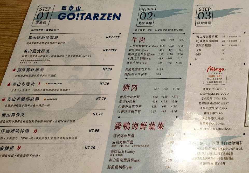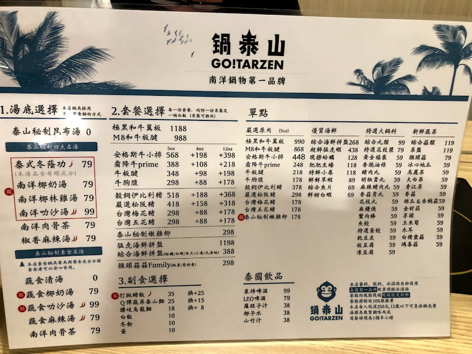 湯底:基本的昆布湯煮完蔬菜之後很鮮甜,不會過鹹,其他湯底我沒嘗試但看起來蠻特別,第一次遇到這種南洋風味的火鍋 菜盤:略少但除了蟳味棒都很不錯,可以換肉 板腱牛:讚讚,肉切得很厚,不會一下鍋就直接過熟,有機會再來的話應該試試Prime霜降牛 梅花豬:乏善可陳,略退冰之後就散了有點悲劇,而且以豬肉必須煮全熟來說油花太少有點柴,不過是送的就算了 泰山麵:不能說不好吃,單吃不錯,但配火鍋太搶味了些,濃濃紫菜味(?,感覺還是選白飯或雞蛋就好 整體來說是有品質的火鍋店,有特色服務態度好,從沒看過的泰國冰淇淋吃到飽,但要吃爽得掂掂荷包。