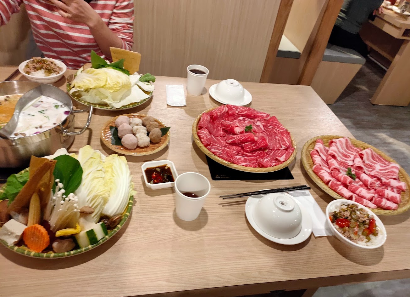 喜歡位子的格局不會跟鄰近桌的靠太近 是個放鬆用餐的環境 是以鴛鴦鍋形式, 選的湯底是冬蔭功和椰林雞湯, 主餐選了牛板腱和牛胸腹, 加入會員兌換了梅花豬和小卷, 表現的都在期待內,味道口感都不錯夠味