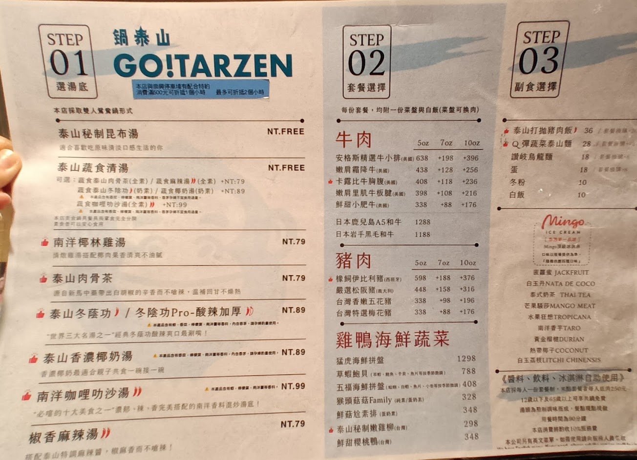 肉骨茶湯底很棒 口味濃郁但不會太重鹹 份量很足,冰淇淋超讚 如果喜歡榴蓮的話一定要試試 泰奶口味比起來會稍微清淡一點 泰國啤酒是淡啤酒清爽口感,夏天吃火鍋 來一罐很剛好 服務 內用 餐點類型 晚餐 平均每人消費金額 $600-800 建議的餐點 泰山肉骨茶湯底