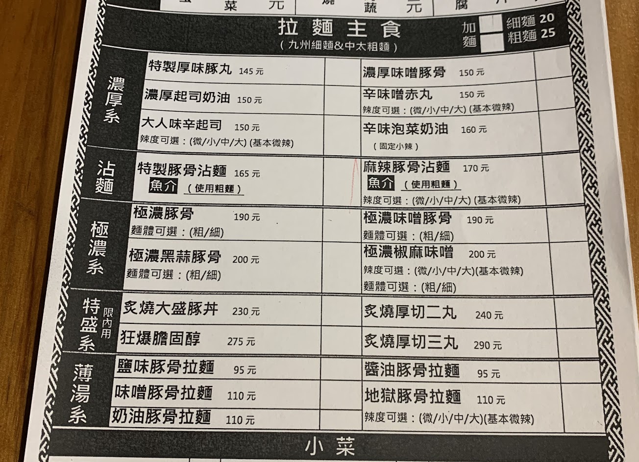 111.9.24來訪,菜單上價格都不貴,以份量上來說是非常有誠意的,點了一碗200元的濃厚黑蒜豚骨拉麵,跟預想的味道差異滿大的,照片上的黑蒜油跟實際收到的麵有落差,店家解釋是已經融入了湯裡面,那就建議直接淋上去或者修改菜單照片,不然真的很難分辨~ 是碗好吃的拉麵,只是愛吃蒜味的人,可以請店家多添加黑蒜油,增加風味 平價的拉麵價格跟份量,絕對是值得再訪的拉麵店家,座位跟人手不多,等候時間還在可接受的範圍,推薦來訪可以先從便宜的開始吃起,不過這邊停車不易,開車的人要停遠一點比較方便