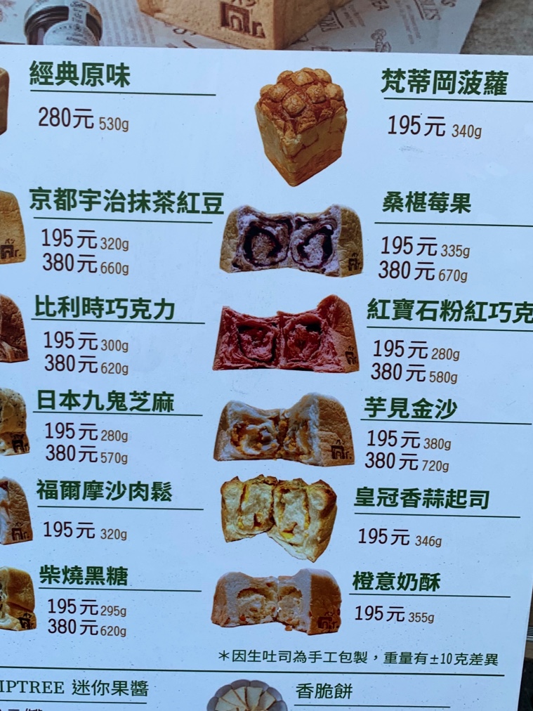 在隔壁喝咖啡時經過這家店,好奇了很久,昨天就請先生過去買!原來是日本很夯的生吐司!各買了一個波羅、巧克力口味的一共快400元!但我必須老實說:跟日本的品質有差!當然這種生吐司是不能用價格去衡量!但都寫頂級了!一條195吐司並沒有這樣的質感!有失望!
