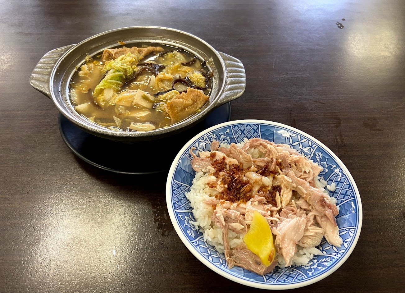 火雞肉飯雞肉不乾澀,淋上油蔥香嫩好吃,再搭配上一碗砂鍋菜就覺得這餐很滿足了