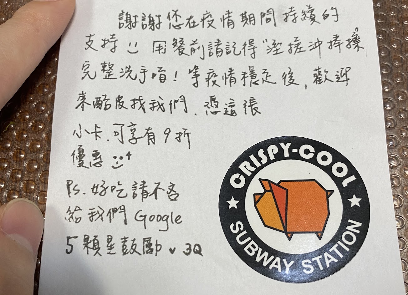 還有手寫的影印小紙條,讓人覺得很窩心,有沒有重視客人的感覺真的很重要,希望你們生意興隆,疫情穩定後再去找你們?
