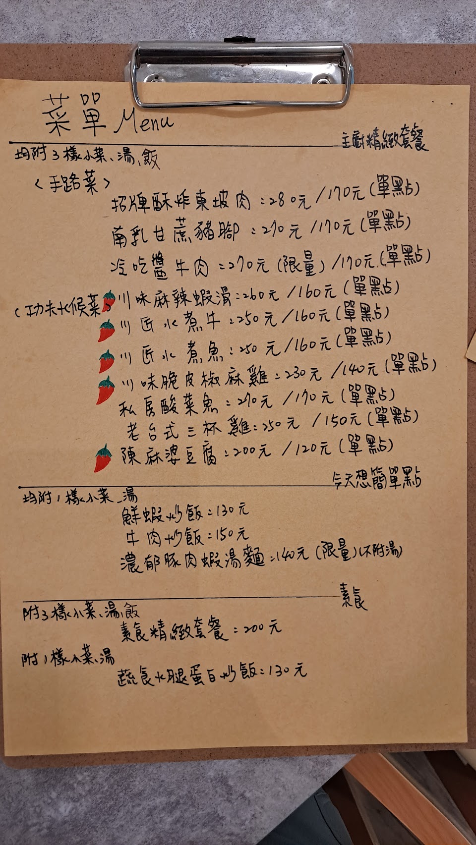 點了口水雞、椒麻雞、招牌酥炸東坡肉、老媽的青龍排骨