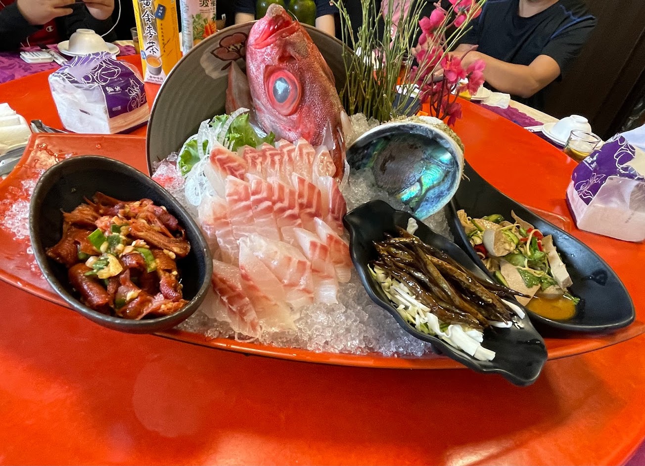 食材新鮮又好吃!10大1小約莫7-8000元,生魚片跟螃蟹粥大推!唯獨用餐氛圍普通,除非你不介意別人公開大唱KTV導致講話要用喊的…