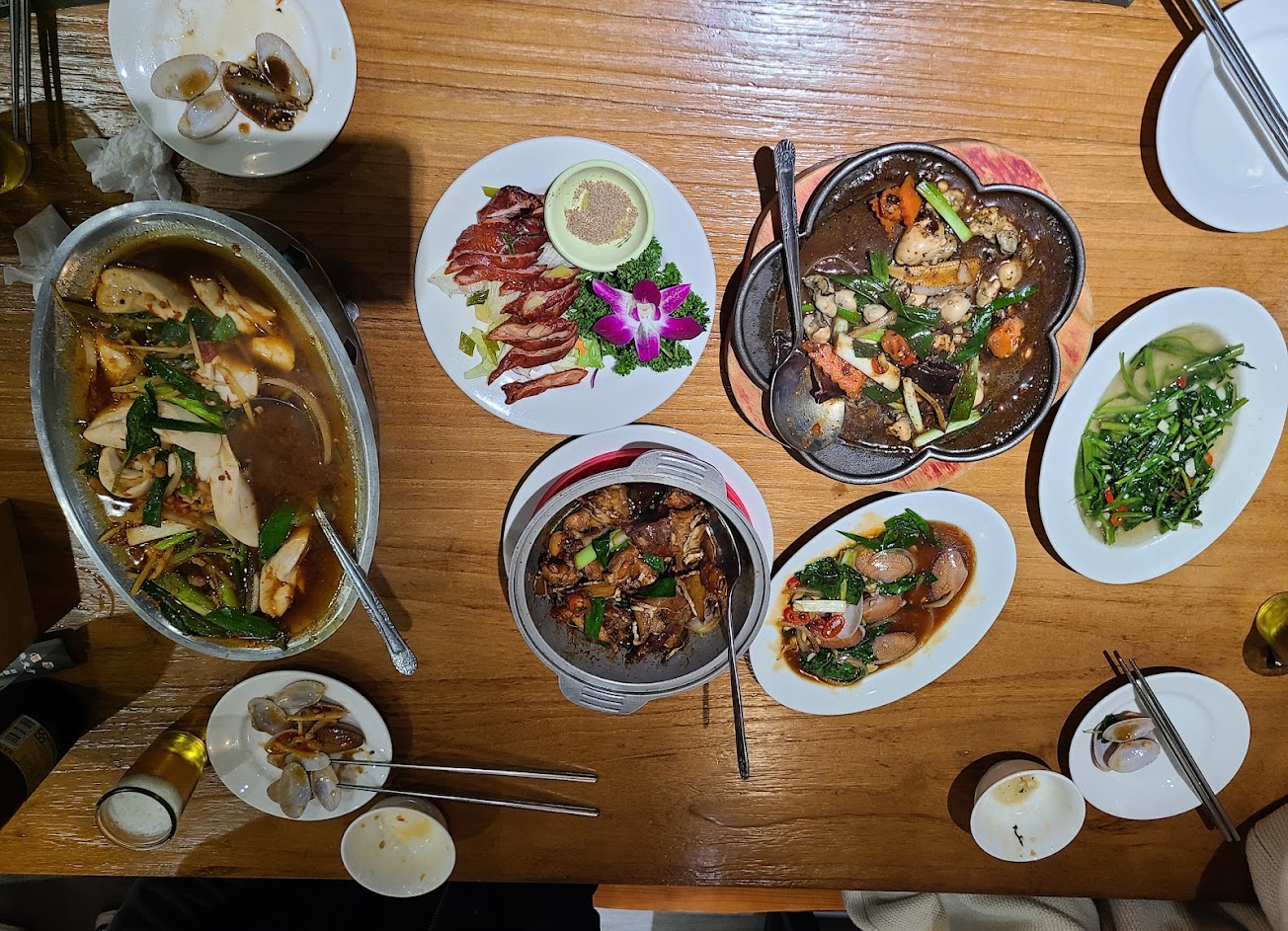 假日人太多最好要訂位 菜的口味都很不錯 但招牌菜的雞價格頗貴 雞胸部位太柴 雞腿部位好吃