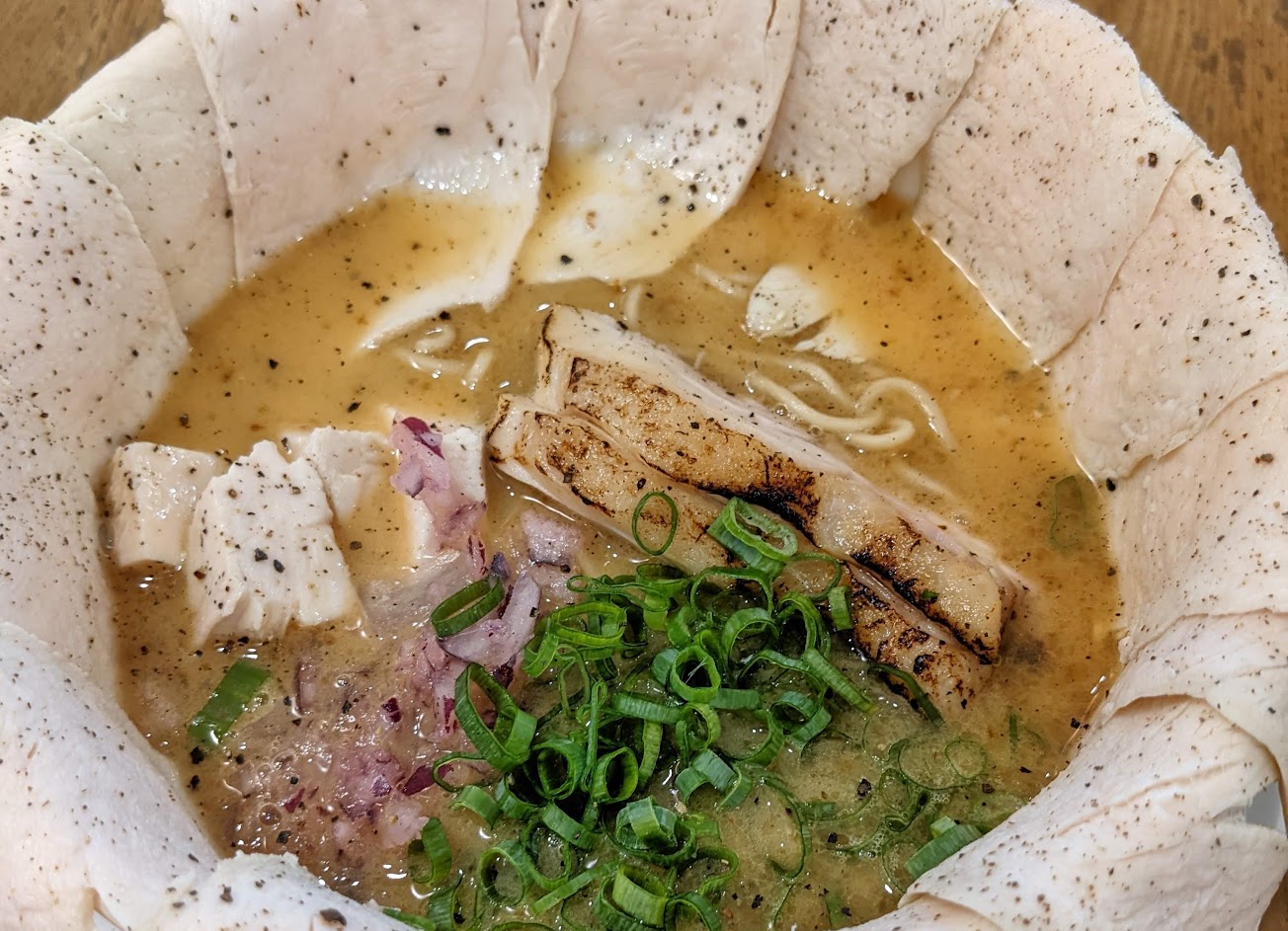 一聽說是東京拉麵超極丸的二店就一直很想來吃吃看的口袋名單之一,雖然與本店是不同風格的拉麵,但吃完之後跟超極丸的落差感是蠻大的,鹽味雞湯雖然剛入口時相當地好喝,但喝到最後會覺得很鹹很膩,麵體是使用蕎麥麵,對於愛好細硬麵的我來說,麵體的口感是相當地好!而綜合會有三種不同的叉燒,如果沒有認錯的話分別應該是:稍微炙燒過的雞腿肉、舒肥雞胸肉片、舒肥雞胸肉塊,雞腿肉蠻嫩的不太有雞肉的腥味,且舒肥過的雞胸肉也不會過柴,整體來說是一間還算不錯的雞湯拉麵。