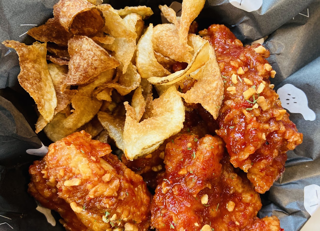 蒜香奶油鹹醬炸雞好吃,炸雞裡的薯片超級好吃! 韓式辣味炸雞完全母湯,滿心期待的糖餅只有一片,很貴而且有奇怪的苦味,跟工作人員反應之後,得到之後會多加注意的回應,不會再訪。