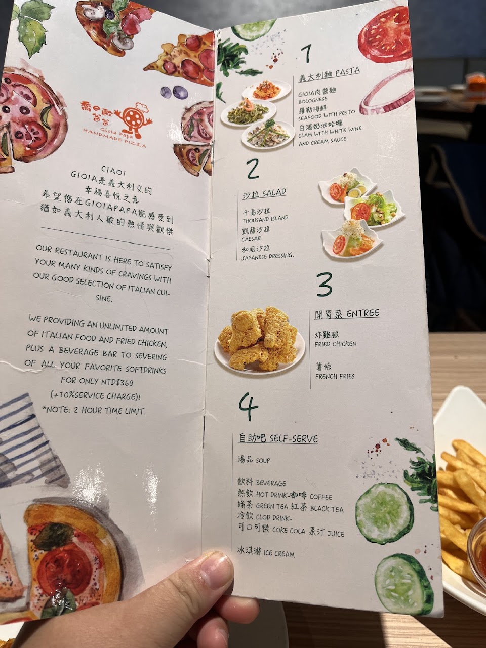 這次是隔了大半年才又來吃..心想廚師是不是換了..多了好多料..口感也更好吃了..依然是吃撐了..唯一缺點…送披薩的態度不是很很好..價格來喔!跟新一下..現在假日一人含服務費461元