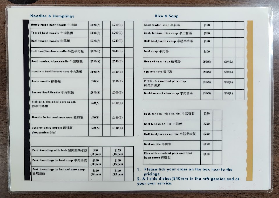 一碗半筋半肉牛肉麵220$ 一碗牛肉湯麵忘了多少 還有一盤水餃 屬於價格蠻高的牛肉麵店 加了牛油以及辣椒湯頭變得過鹹不辣, 對無辣不歡的我有點失望? 但肉蠻好咬,筋也軟嫩,麵體雖然是寬版有厚度的麵但不難咬而且也有入味所以給過