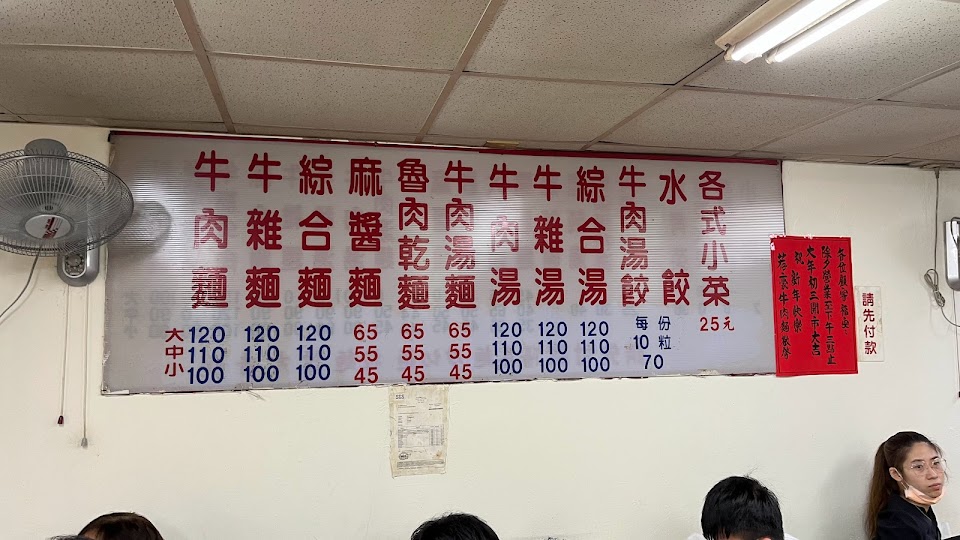 牛肉麵大中小100~120的價位,在台北已經超難找到了!重點份量很大又好吃,食量大也絕對可以吃很飽!湯喝不夠還可以免費續,飲料也是暢飲(多種選擇)店內也有供應冷氣,調味料除了辣椒外還有兩種牛油,酸菜,蒜頭都讓你自己加到滿意!cp值超高!