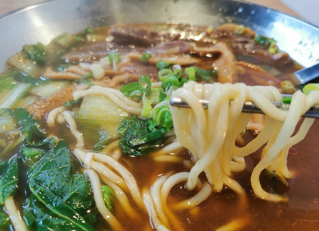 牛肉片6-7塊左右,湯頭美味,麵條順口。親切的老闆娘只有一個人忙碌,會詢問客人口味喜好,更改麵條種類與醬料。適逢熊好卷大舉進駐(包含我們?)雖然等待較久,闆娘說給我們多一點燙青菜以表感謝。闆娘辛苦了!