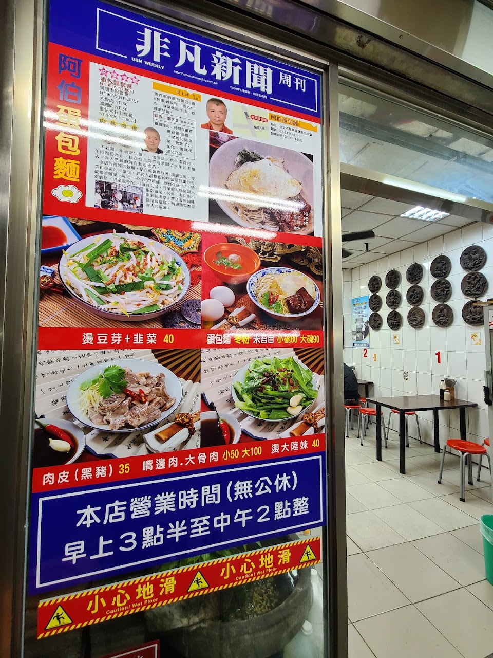 第一次吃阿伯蛋包麵是十幾年前,當時是朋友介紹帶去的,麵附的豆乾兩片,半熟蛋一顆,加上一些酸菜,搭配他們的醬油膏,還有醋跟辣椒油可以自己添加,小菜幾乎都是傳統小吃店有的選項,阿伯蛋包麵凌晨三點半就開始營業了,以前唱完歌肚子餓,「如果在萬華唱歌」結束之後都會來吃碗麵,套餐就是分大小碗麵條,小碗的貢丸湯,貢丸一顆,麵條細,滑潤,醬油膏甘甜,半熟蛋的蛋黃液體留下至麵上,在口腔中是非常搭配融合的,不過營業到下午14:30就打烊了,所以沒辦法無時無刻時間都能吃的到,值得一試!!! 服務 內用 餐點類型 早餐 平均每人消費金額 $1-200