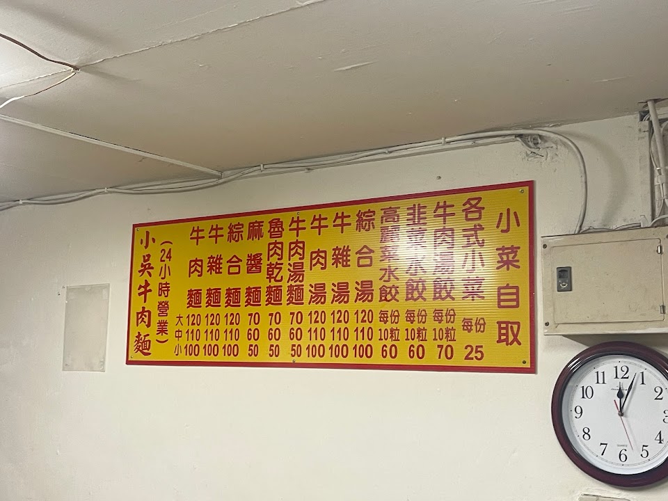 洛陽街上牛肉麵一條街裏的老店,這家招牌上寫24H,不知道是不是真的24小時營業。 它的牛肉麵很好吃,綜合的裏面還有些牛雜等,小碗100,中碗110,大碗120元,絕對能讓人吃很飽又平價的美味! 小菜除皮蛋豆腐是30元以外,其他都是25, 有小黃瓜、泡菜、豆乾、鳳爪等選擇很多。 小吳的湯頭我很喜歡,有股淡淡的中藥材味,比起一般醬油湯頭好喝很多。 服務 內用 餐點類型 晚餐 平均每人消費金額 $1-200 餐點:4 服務:4 氣氛:4
