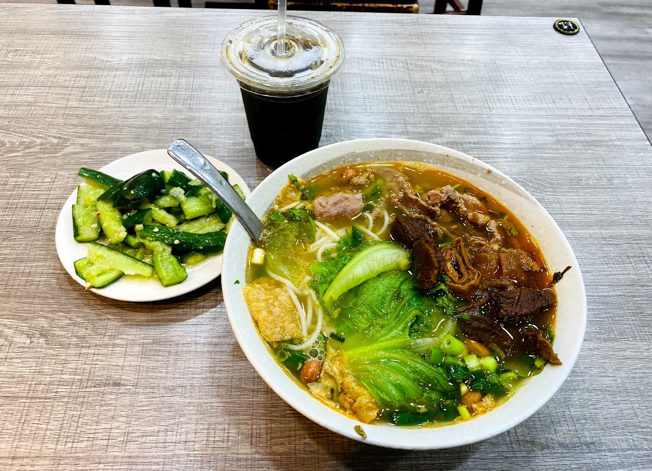 湯頭是小小的酸,不明顯。米粉很特別,有嚼勁。牛肉的部分則讓人驚艷,有牛筋肉吸飽了湯汁,肉質不錯。份量也很大碗。重點是,18:20去,店裡幾乎滿席。