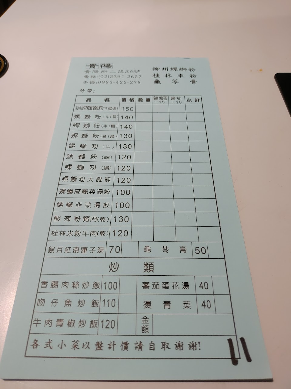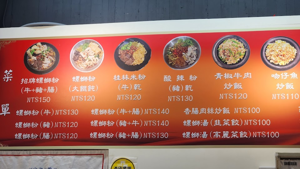 招牌螺絲粉(150元)有牛肉、豬肉、腸子、豆皮、酸豆等,料豐富,湯頭不辣,對不吃辣或腸胃弱的人很友善,可自己加檸檬醋或辣椒醬來調整口味;桂林米粉牛肉(120元)牛肉、酸豆、香菜、花生、酸菜,搭配豆瓣醬,很「唰嘴」;龜苓膏(50元)苦甘苦甘,店家另外附糖漿跟奶精球。味道很不錯,但是店家很有個性,會在客人用餐時剪指甲,第一次遇到呢!