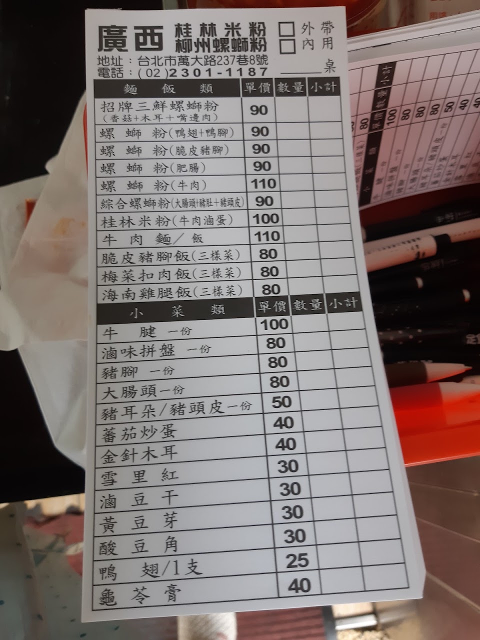 有修正過的螺絲粉,比較符合台灣人的口味,可以自己加酸加辣,空間不大,內用的位子不多,很多人外帶或是外送,生意很好 餐點:5 服務:3 氣氛:3