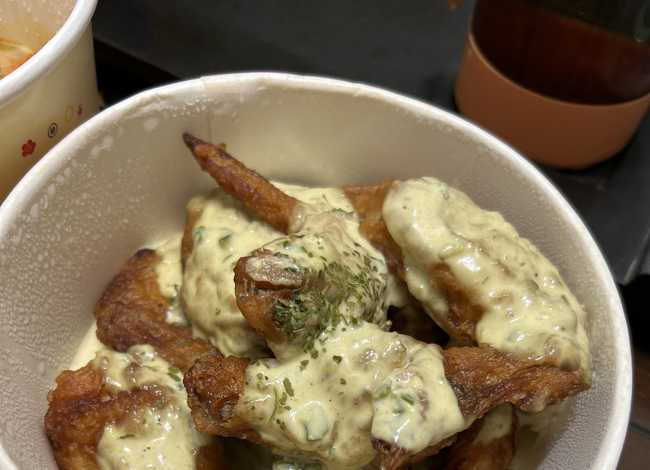 點了一份起司奶霜的韓式炸雞、一份三鮮炸醬麵,