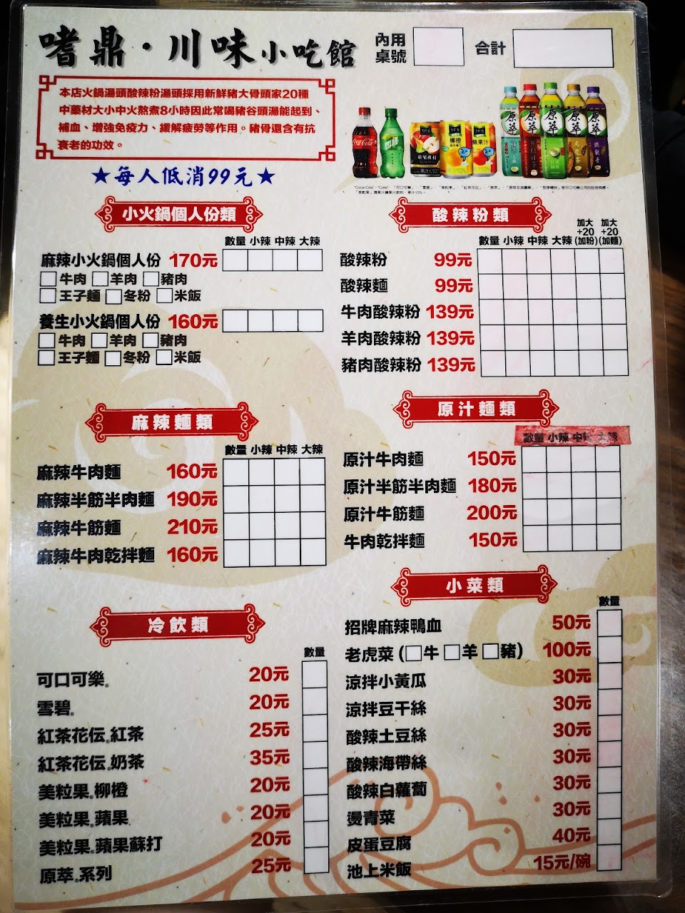 位於西門町小巷內的川味小館,每人低消一碗粉或是鍋物,店門外有自助點餐區,可惜的是只能現金,希望未來有機會加入電子支付。