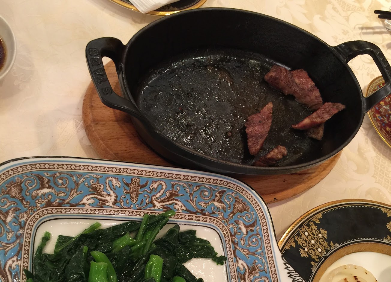 在海鮮料理店點個總舖師特別做的牛排,附上side dish 很好吃,絕不輸牛排館。師父招待的芥藍菜川燙再炒置在Wedgewood盤內,免費卻好吃。