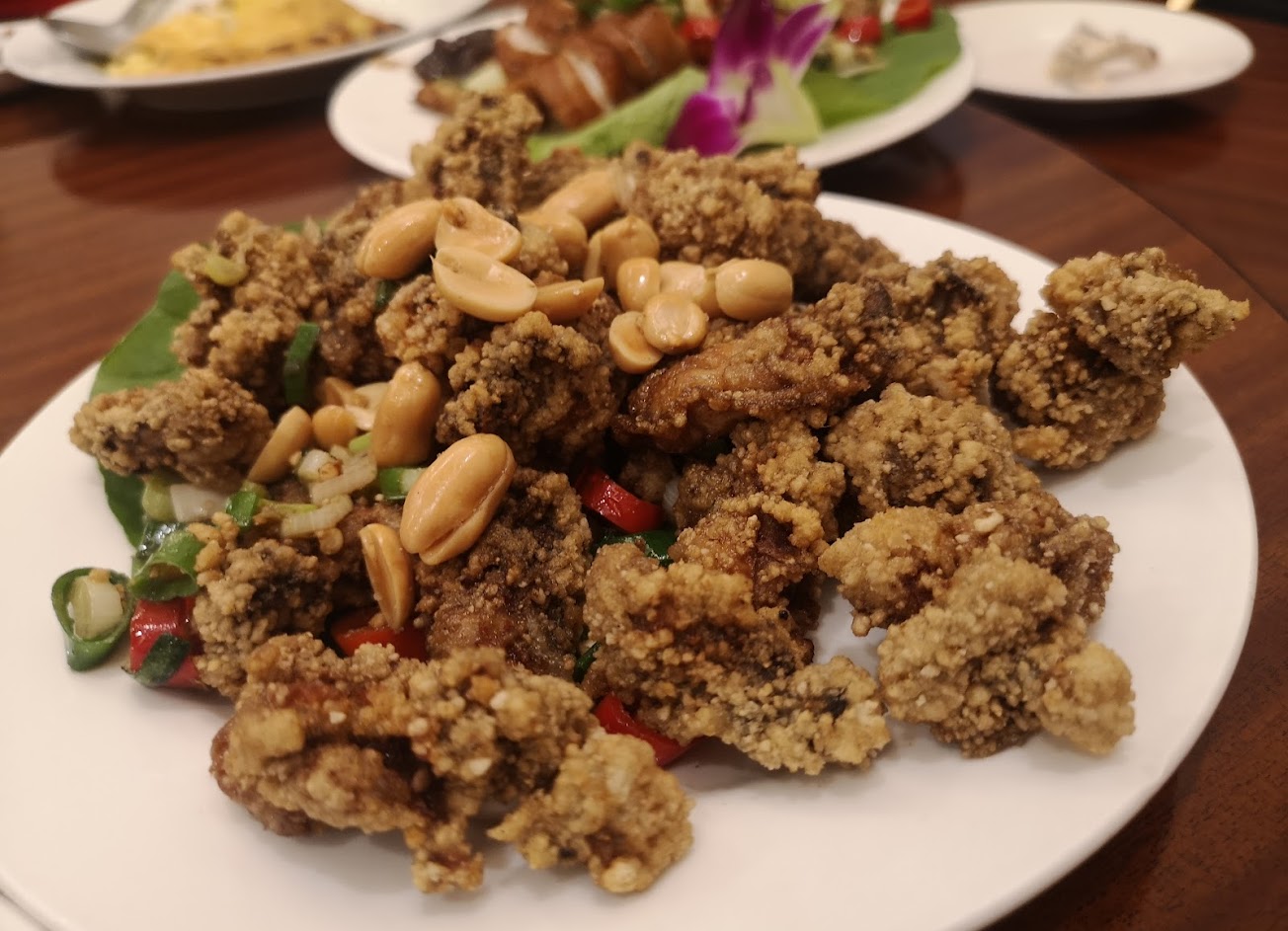 蚵仔酥沒有給胡椒鹽而是搭配花生+炒過的蔥蒜