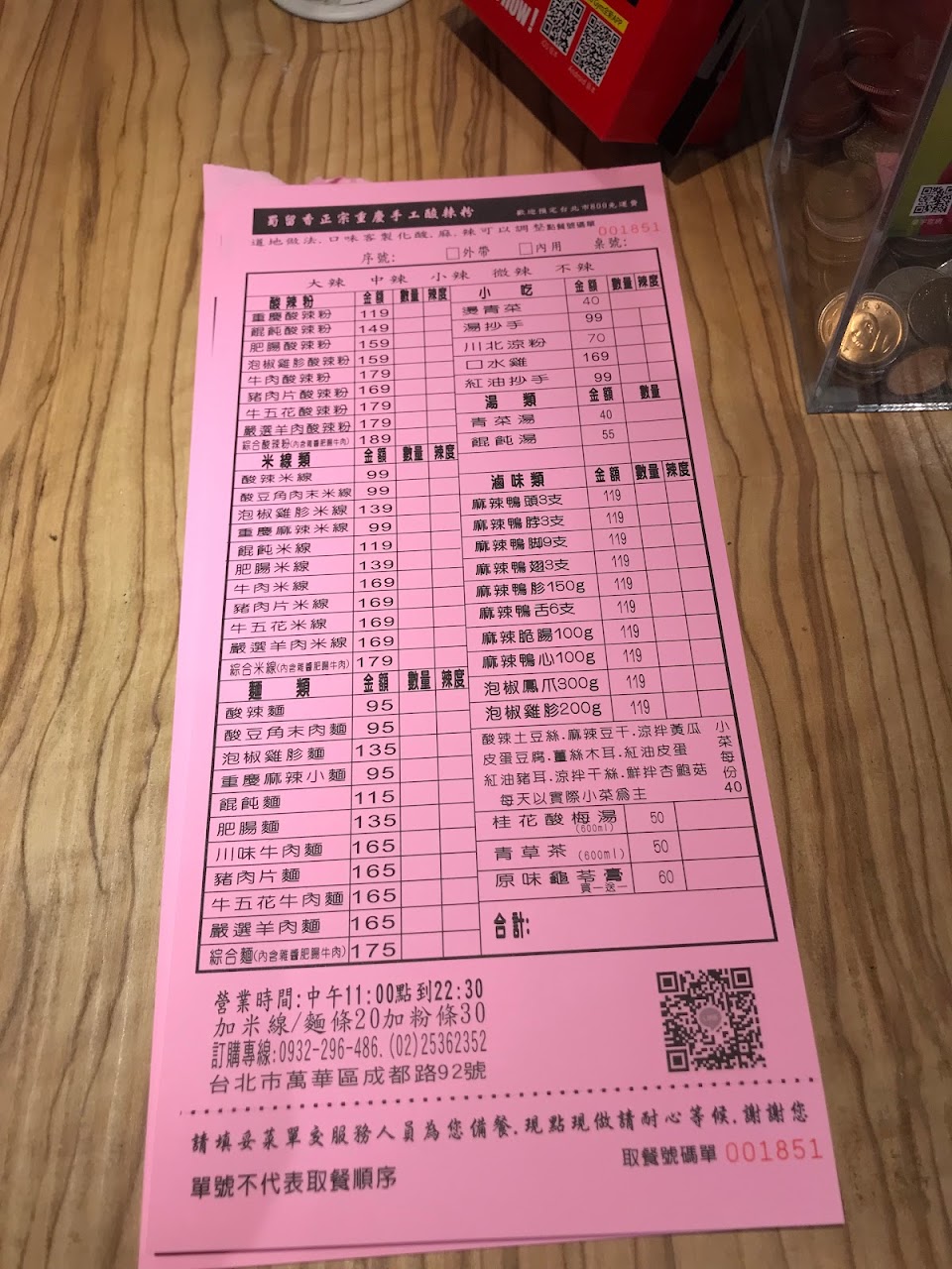 點了大辣還是沒有辣 感覺跟正宗的差了九條街 可能是為了迎合台灣人的口味做調整吧!如果去過重慶吃正宗的 會覺得很失望 因為它的口味調整成大眾比較能接受的口味 但還是推薦沒吃過正宗的人來嘗試看看!