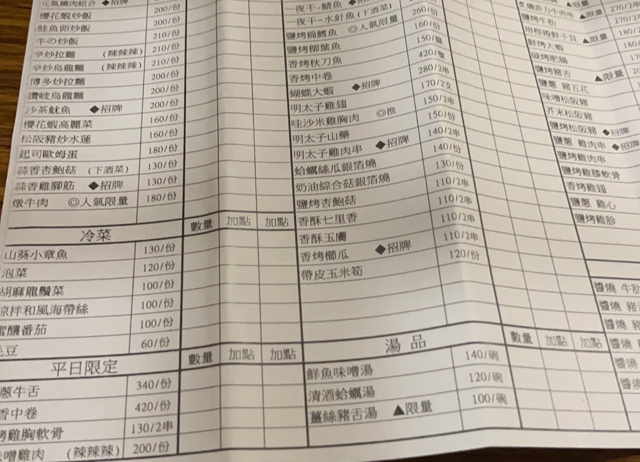 串燒類豬舌厚度夠,內部不乾柴有水分,咀嚼下有嚼勁的口感帶來跟牛舌不一樣的享受。 牛橫膈整體軟嫩有厚度,但與牛肋條建議點一種就好。 蔥鹽雞肉串其雞肉肥厚且水分十足,可惜雞皮焦香味不太夠。 烤香菇最失敗的是裹的醬料,選用太甜的醬料讓人無法接受。杏鮑菇水份十足、櫛瓜內部軟嫩但覺得厚度不足。 辛炒拉麵辣度較高,建議敢吃辣再點、炒水蓮搭配香菇及松阪豬,增加不一樣的口感及層次。 鯖魚雖然價格稍高但是肉質肥美。明太子山藥及蛤蜊湯就蠻普通且空虛。 整體食物及梅酒種類多,價格稍高,內用環境油煙味重、假日人很多建議訂位,目前評論5星就送小菜or酒,快來評論。 服務 內用 餐點類型 晚餐 平均每人消費金額 $1,000-1,200