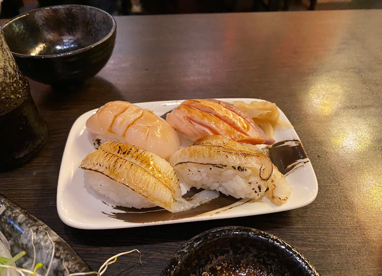 ?蔥花生鮪手卷,算是用餐完之後最推薦的一個品項,調味剛好,份量也剛剛好,鮪魚份量也有誠意~ ?生魚片握壽司系列,算是新鮮好吃,厚度及油脂的不錯,但是一貫的價錢$40up,就覺得…沒那麼特別了 ?松阪豬串燒,燒烤的程度剛剛好,酥脆的外皮,還有油脂的香氣,但串的肉質偏肥!咬下去之後的口感第二口開始會慢慢覺得油膩 ?起司豬肉,是培根豬肉串燒上面灑上起司粉,一樣是豬肉的部分咬下去裡面的肥肉偏多,完全影響了起司的味道,吃不出香氣反而會有點油膩… ?明太子白醬烏龍麵,烏龍麵的口感偏軟唷~味道吃起來就是直接聯想到白醬義大利麵的味道?沒有其他特別的感覺
