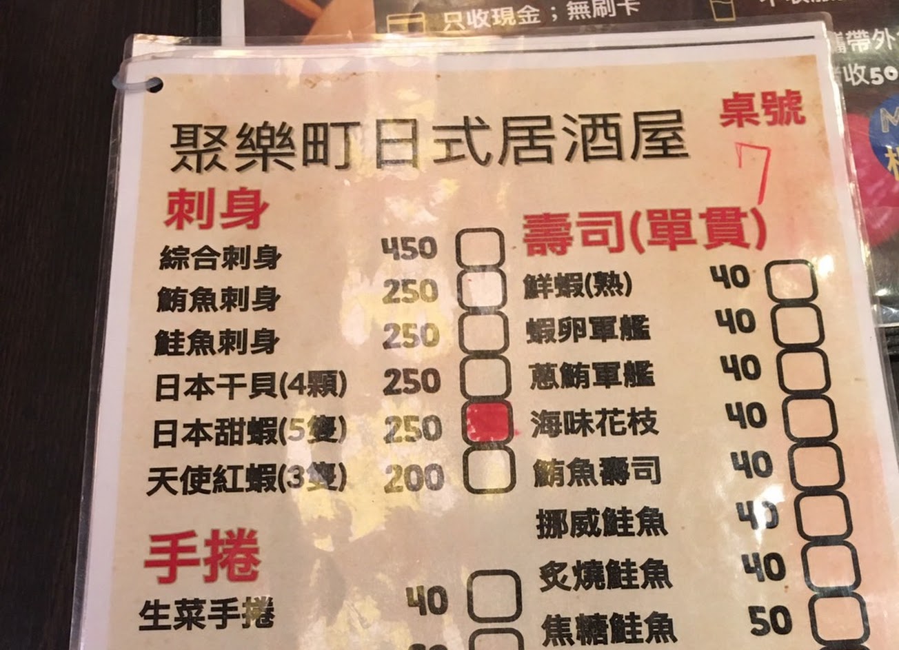 ?蔥花生鮪手捲$60 覺得最好吃CP值最高的一個餐點 把鮪魚生魚片切丁 再配上蔥花+生黃瓜+生菜+芥末+醋飯 口感層次豐富 推? ?明太子白醬烏龍麵$200 吃起來就像白醬義大利麵+明太子+香菇 雖然感覺很普通不過白醬滿濃郁的 ?生魚片握壽司(一貫)$40 吃了鮪魚以及鮭魚 覺得生魚片挺新鮮的 中規中矩 ?起司豬肉捲串燒$90 兩種起司 培根裡面包起司 外面再灑上起司粉 熱量爆表 不過到最後實在是有點膩不知道是在吃培根的油還是吃起司 ?鹽烤松阪豬串燒$150 脂肪的比例蠻高的 吃起來脆脆的很帶勁 但是到後面就覺得有點膩 因為太油了 ?酥炸雞皮$100 就是簡單的炸雞皮 再灑上胡椒鹽 吃起來嘴巴會很乾 適合當作下酒菜 ?炒水蓮$120 普通的炒水蓮 覺得還可以再炒香一點 ?招牌麻吉燒$100 兩串共六顆烤麻糬 不得不說烤的真的不賴 外面酥脆裡面Q彈 推 ?海鹽檸檬沙瓦$160 無酒精 又鹹又甜 覺得雪碧味很濃 服務 內用 餐點類型 晚餐 平均每人消費金額 $600-800 餐點:4 服務:2 氣氛:1 建議的餐點 蔥鮪魚手捲