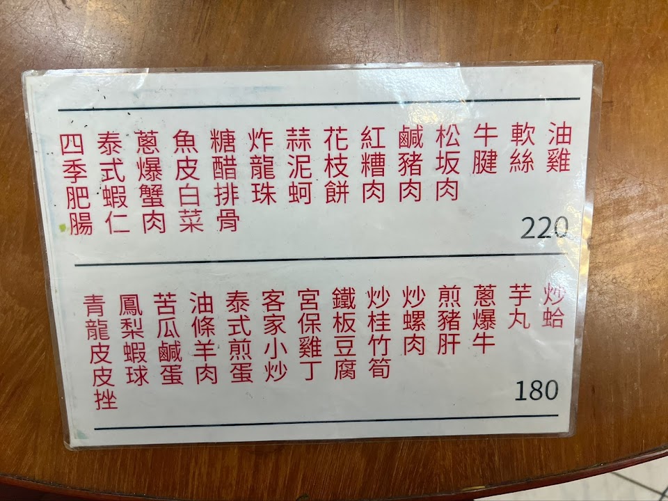 推薦菜色清單,只推薦吃過就回味的菜色: 油條牛肉(可換其他肉類) 龍珠 蠔油中卷 泰式蛋 鐵板豆腐 金沙豆腐