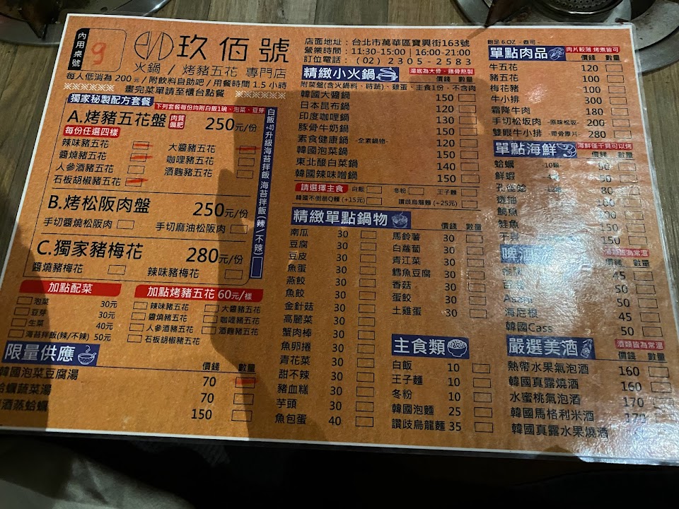 2024最新在地推薦餐廳的菜單_玖佰號 火鍋/烤豬五花 專門店的菜單、圖片
