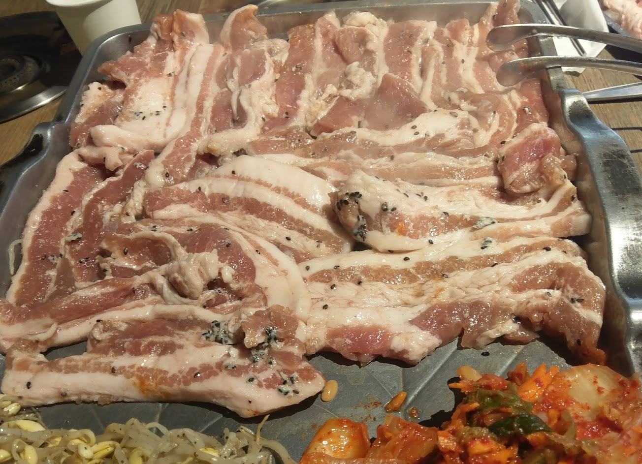 11/30在網路上找尋烤肉店時發現的人氣店,跟朋友一行三人約好前往,下午三點人潮也還是不少,點了一份五花肉、麻油松阪豬、韓國泡菜湯,五花肉很好吃,一份可以選四種口味,松阪豬口感太硬,咬的挺費力,泡菜湯蠻有辣度但是不錯喝,算是一家cp值不錯的店家,可惜交通很不方便,捷運龍山寺站還要轉公車才能到達