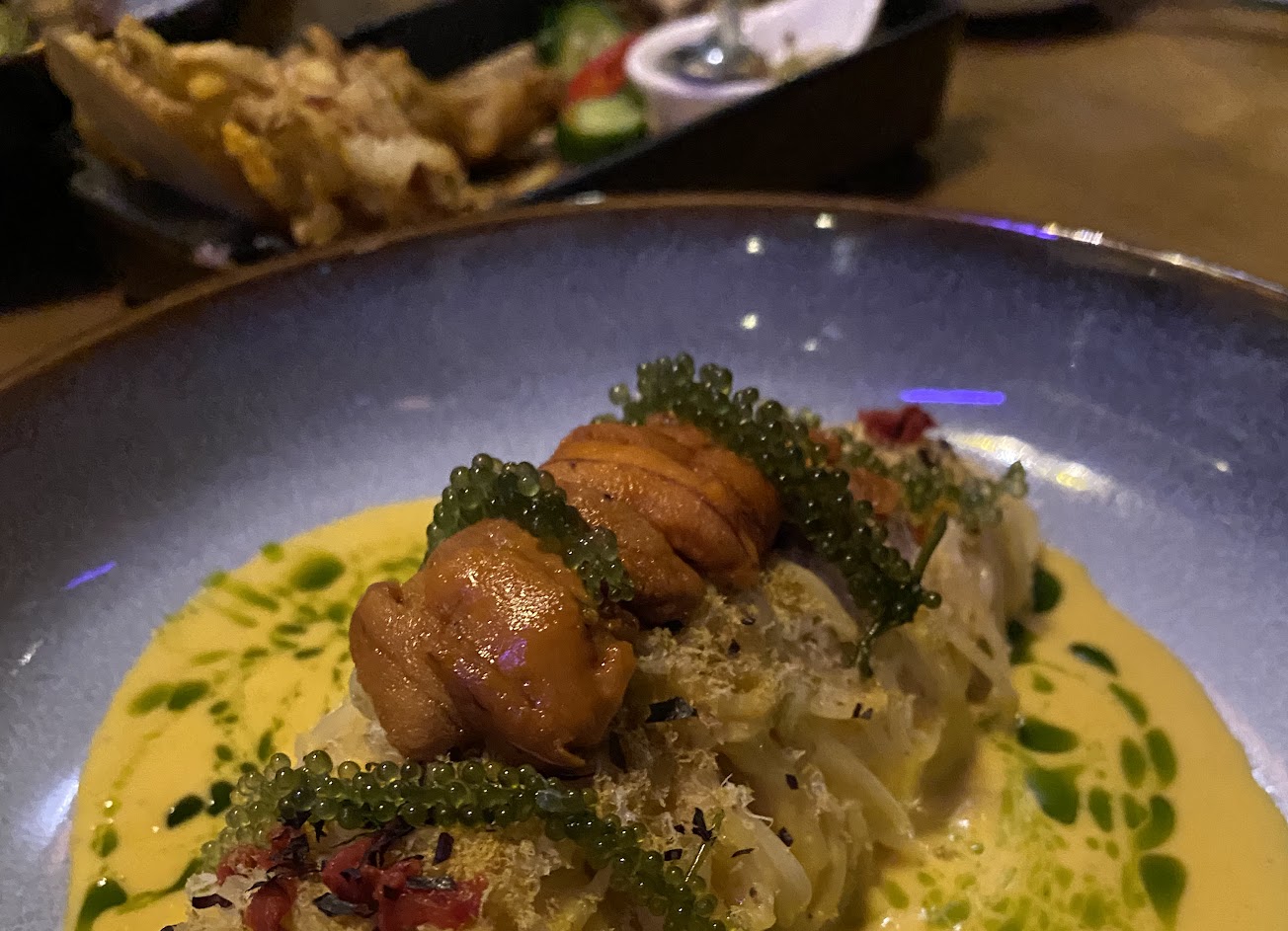 海膽麵:它要價六百元,調味有蛋黃醬、海膽帶來的豐厚口感,海葡萄在口中逐一爆開時的驚喜,為整道麵增添不少風采。可這是一道麵,店家在上桌之時就叮囑我們快快拍、快快吃。我光速按完一下快門就立刻夾麵送入口中了,沒想到麵體軟到像煮過的細泡麵,就算是天使細麵也不該煮成這樣呀Q_Q