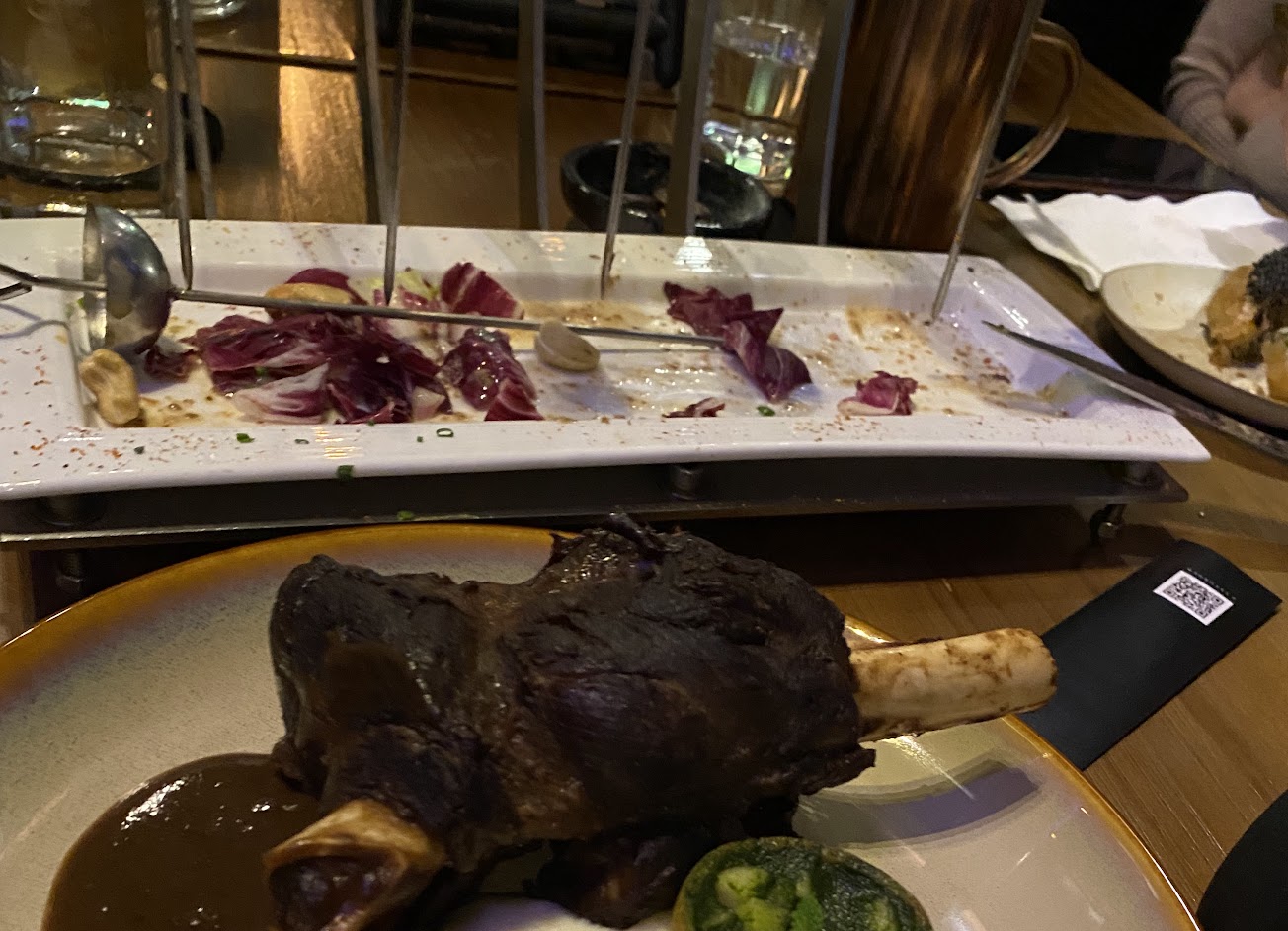 用甜筒餅乾裝的蝦鬆加了芒果丁跟優若乳的美乃滋屬於清甜但也吃不到蝦鬆本身該有的口感 店員極力推薦的海膽義大利麵我只能說味道就是一個怪而且有些腥味,好看大過於好吃 梅花豬鵪鶉蛋墨魚燉飯,米心是偏硬的義大利口感,墨魚汁屬於重口味海鮮搭配豬肉其實就是各自為政沒有激盪出火花 胡椒餅算是今晚最棒的一道,肉跟蔥的比例剛好表皮也很酥脆,點3個就可以不踩雷麵跟飯了? 因為沒吃飽又加點炸蔬菜跟仆肉…嗯麵衣有點太多太油 照片中有一道是別桌預訂的酥皮內包鹿肉@@純粹因為特別而拍照,價格應該也是貴貴的..