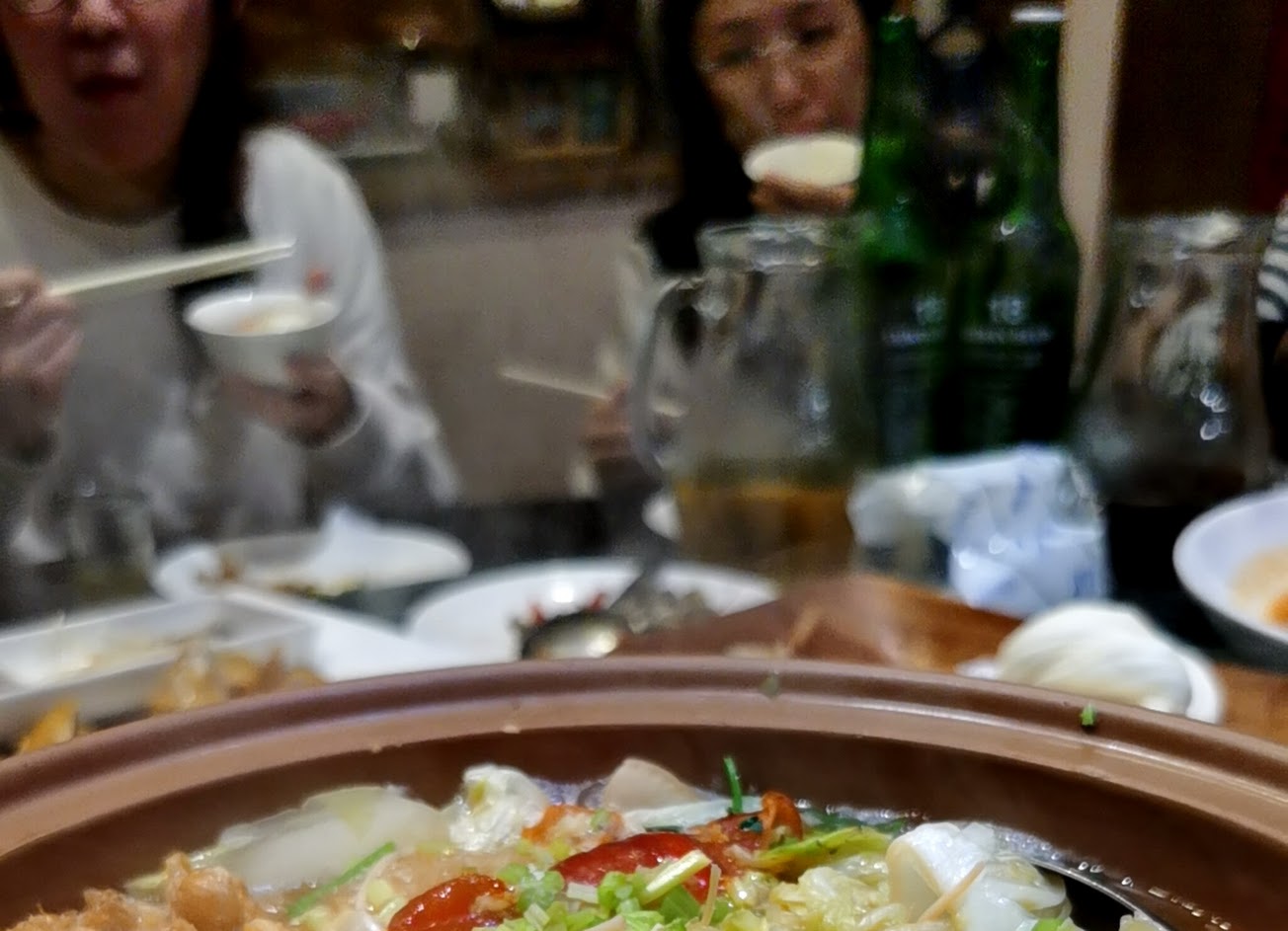 在店外完全想像不到老房子內部的包廂別有洞天,很有年紀的老店,精緻度上就不這麼嚴格。 食材整體來說都非常新鮮,海鮮類若新鮮,本質上就至少及格了,生魚片和螃蟹明蝦都是如此。四季豆肥腸炸得酥脆刷嘴,三杯中卷調味偏甜但中卷些微過乾。湯上雖無奈的佈滿了香菜和芹菜,火腿燉出的甘和白菜燉出的甜,配上炸蛋的蛋香以及魚翅頭,是鍋非常溫暖醇香的湯品。最有亮點的是魚卵,從未吃過如此細緻吃不出卵感的魚卵,令人驚艷!