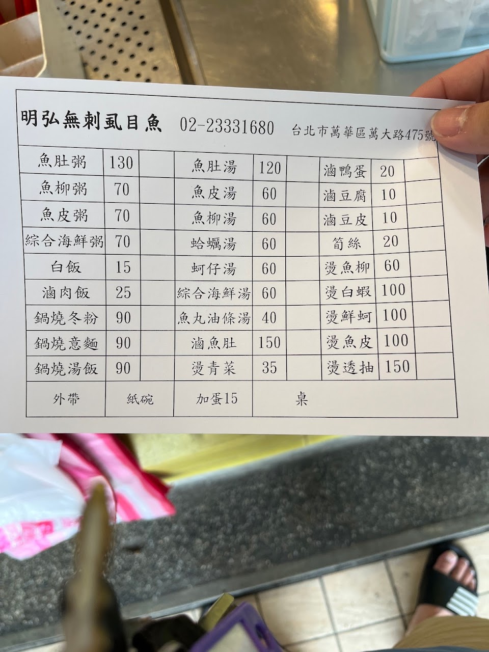 住明弘附近太幸福!! 沒事就可以吃到超新鮮的虱目魚粥 也常常買回家自己煎,真的很好吃了!! 另外老闆的殺魚秀也很療癒,等外帶常常看到入神?? 服務 外帶