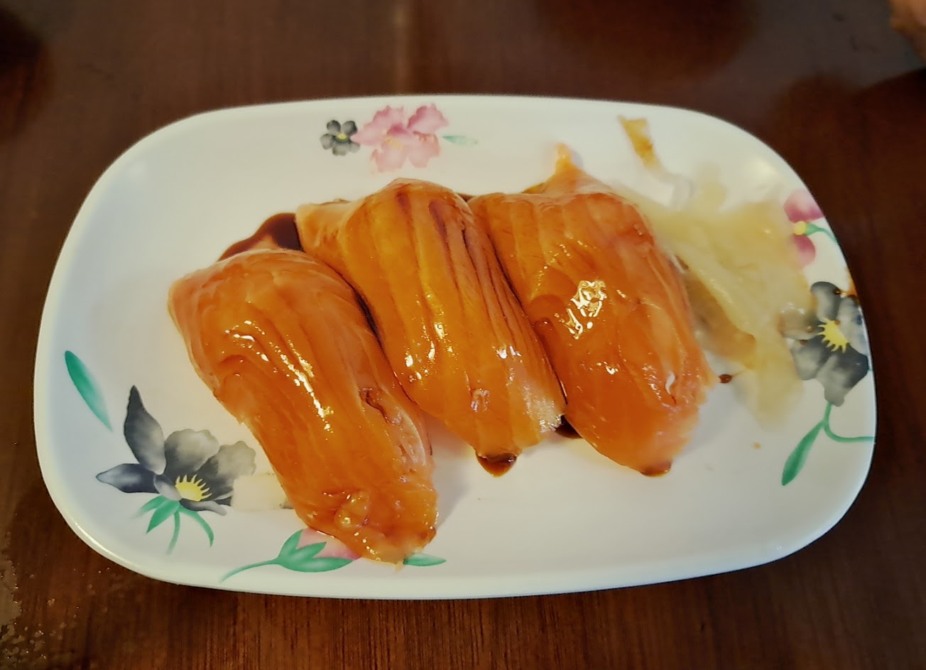 點了鮭魚肚握壽司,份量很大,鮭魚鮮甜,但飯吃起來像路邊攤10元壽司那種整團黏在一起的飯。