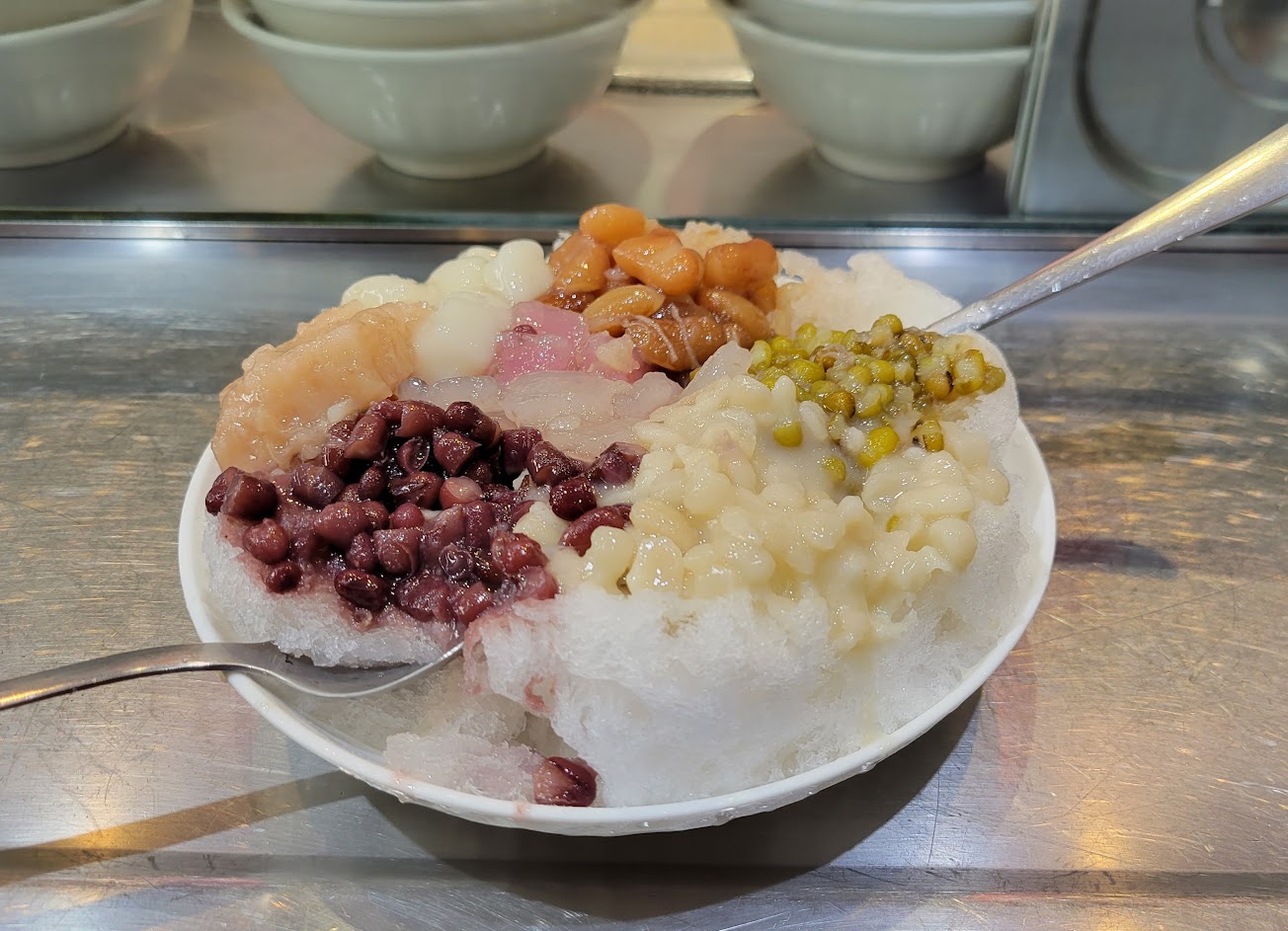 很簡單的古早味刨冰,每種料都很用心熬煮,又保有該有的口感,他們的糖水是白糖做的,刨冰很細密,單純的原始味道是最容易讓日本人喜歡的,所以搬家前日本客人非常多。可惜有點貴。