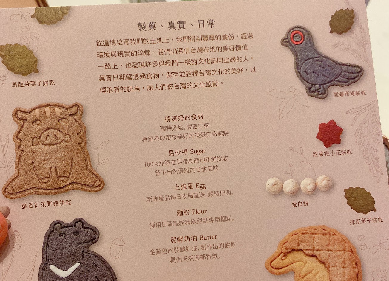 餅乾的造型很特別,都是台灣特有動物,每種動物的口味也都不一樣,是一般市面上比較少見的味道,質地偏硬,但是不會太甜,很好吃!