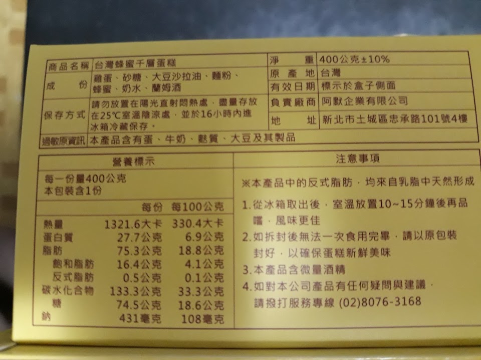 阿默蛋糕的風評一直很好,以前就常買來送客戶,但是自己從來沒買來吃過,今天路過一時嘴饞,就買了一個蜂蜜千層蛋糕(300元),回家一吃確實很棒!蛋糕綿密、口味微甜!太順口了不知不覺竟然整條蛋糕都吃完了!