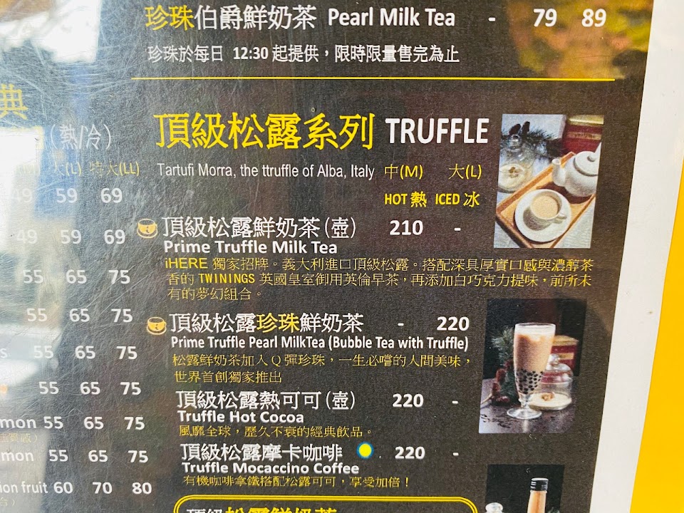 ?法式松露珍奶 $89(特價) ?升級鮮奶 $20 ?刨黑鑽松露片 時價2g $100 ?皇家濃厚鍋煮奶茶 $79 ?濃厚伯爵鮮奶茶 $79 ?朝露烏龍 $30 ?伯爵水果冰茶 $65