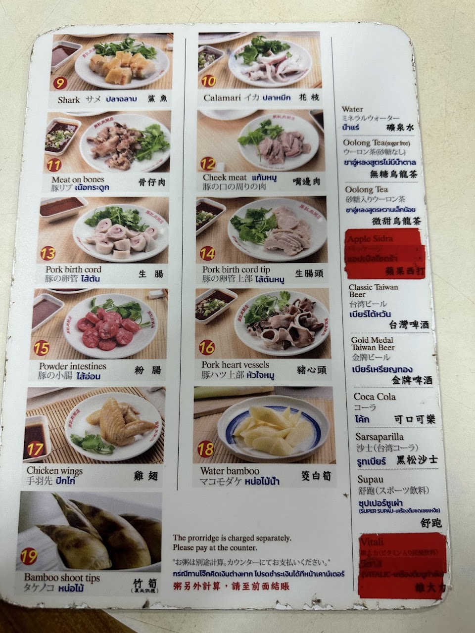 不知道為什麼這家大家評價很好 肉粥15元,然後其他品項都沒有價格 最後結帳時絕對會嚇一跳,雖然先問價格好像也是消費者的責任,但這樣子還是不是每個人都可以接受,口味我覺得很普通。 不過點太少,老闆就擺個臭臉,服務態度應該也算不好。