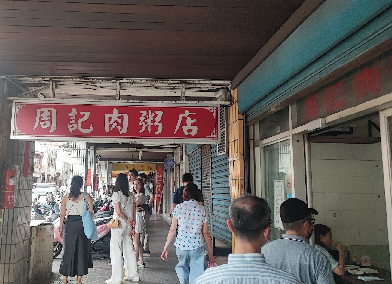 不起眼的店面 古早時代的裝潢 隱身在廣州街上剝皮寮歷史街區附近 這種鹹肉粥是台北人傳統的早餐 周記肉粥幾十年來一早六點就開始營業 用餐的熱門時段或是例假日往往會要排隊 人來人往絡繹不絕就知道生意怎麼樣了
