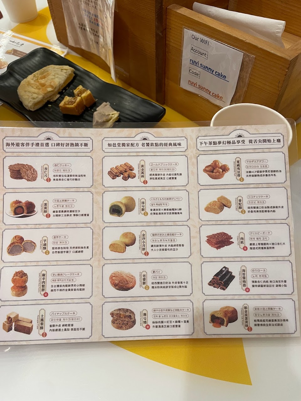 我來這裡是因為這裡的funglisu很好吃,但是我要等大約2個小時,所以我嘗試了其他類型的甜點,買了Sunnycake和Lemon Cake。到店時,會提供迎賓茶和試吃產品,只要在桌子上的訂單單上寫下要購買的產品數量,即可收到產品並付款。