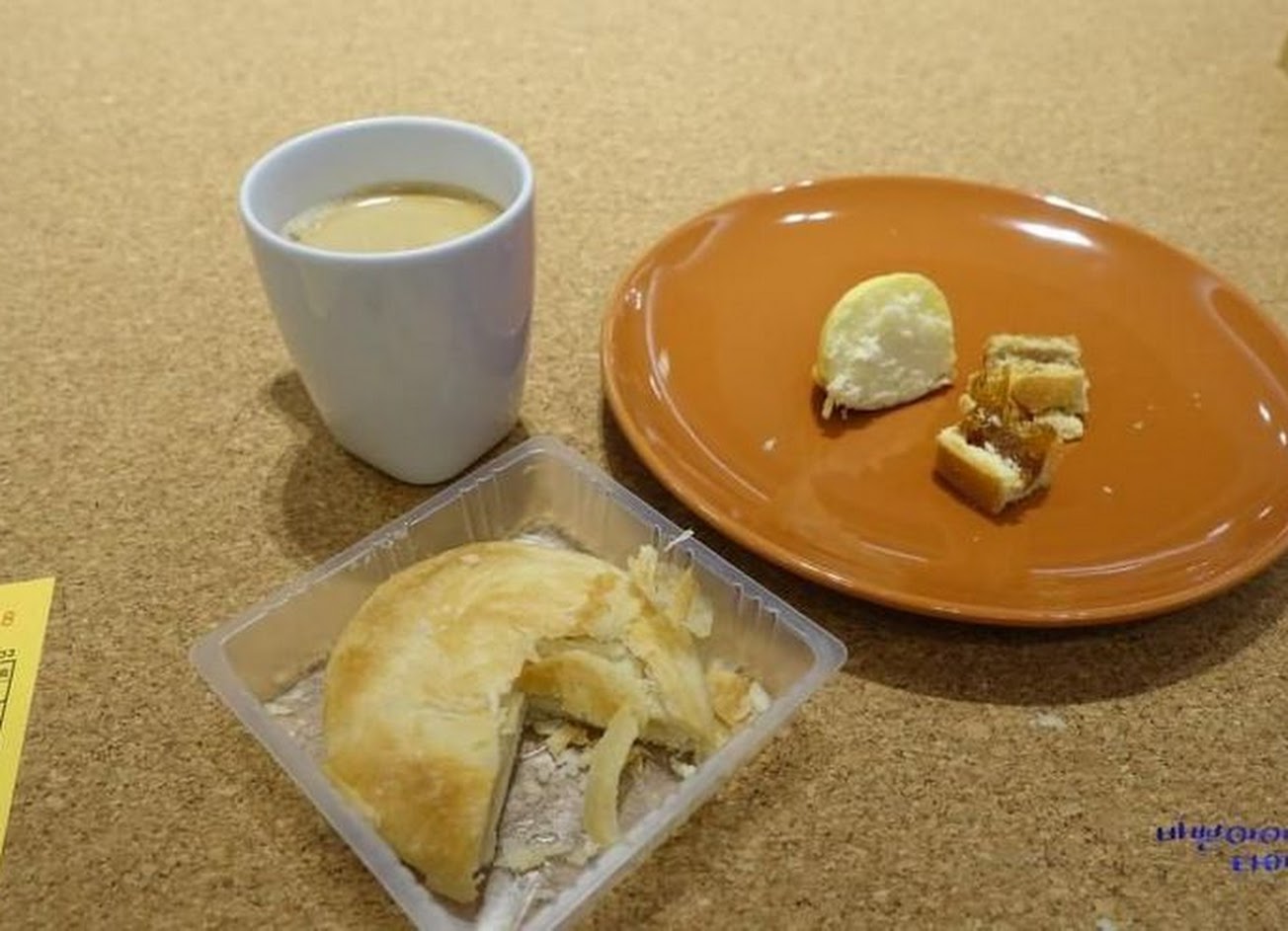 一進去(第一張圖是太陽瓶和茶),要么是茶要么是咖啡,還有一個牛軋糖Pongrisu檸檬蛋糕太陽瓶被切下來給你嚐嚐。