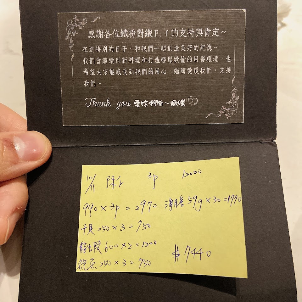優點 :食材新鮮有創意,店員服務態度很親切,最驚豔的一道菜如附上的照片,那是一杯凍檸茶,在氣球破掉時會有一陣香氣,於此時喝下有一種香氣潤喉的口感,非常棒且有創意的一道菜,因為無菜單料理,原以為會很貴,價錢確意料之外的便宜,完全不輸犇、紅花、等米其林鐵板燒,很用心在經營。