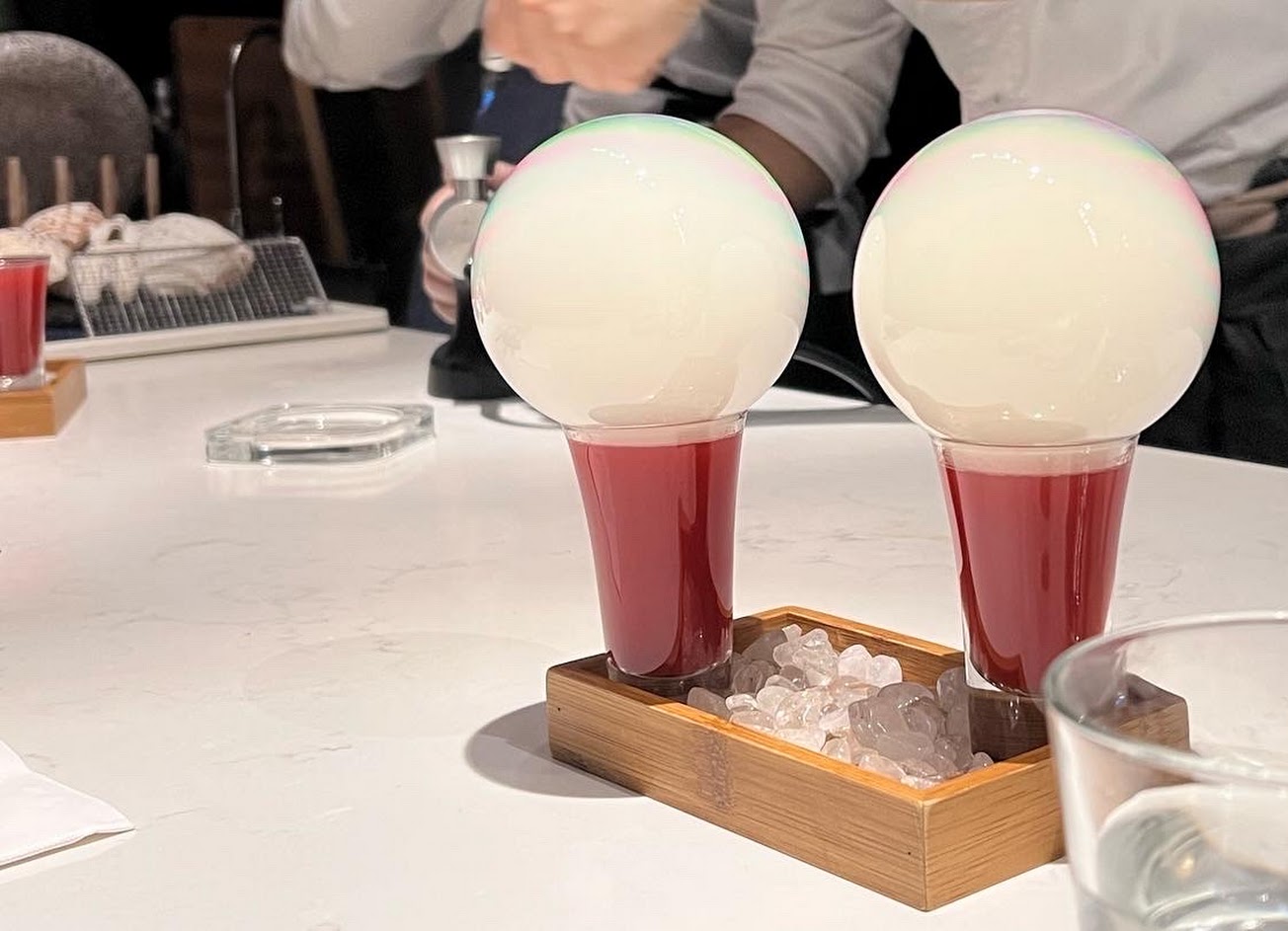 7️⃣ 果汁泡泡: 非常驚奇的一道,利用特殊的設備,打出一個泡泡並將氣體包在裡頭,軟Q軟Q的超可愛的! 一戳破~整個煙霧就爆發出來,師傅建議ㄧ戳破趕緊一口乾了~能夠品嚐到煙霧與果汁彼此相融的味道,略帶一點微微苦味。